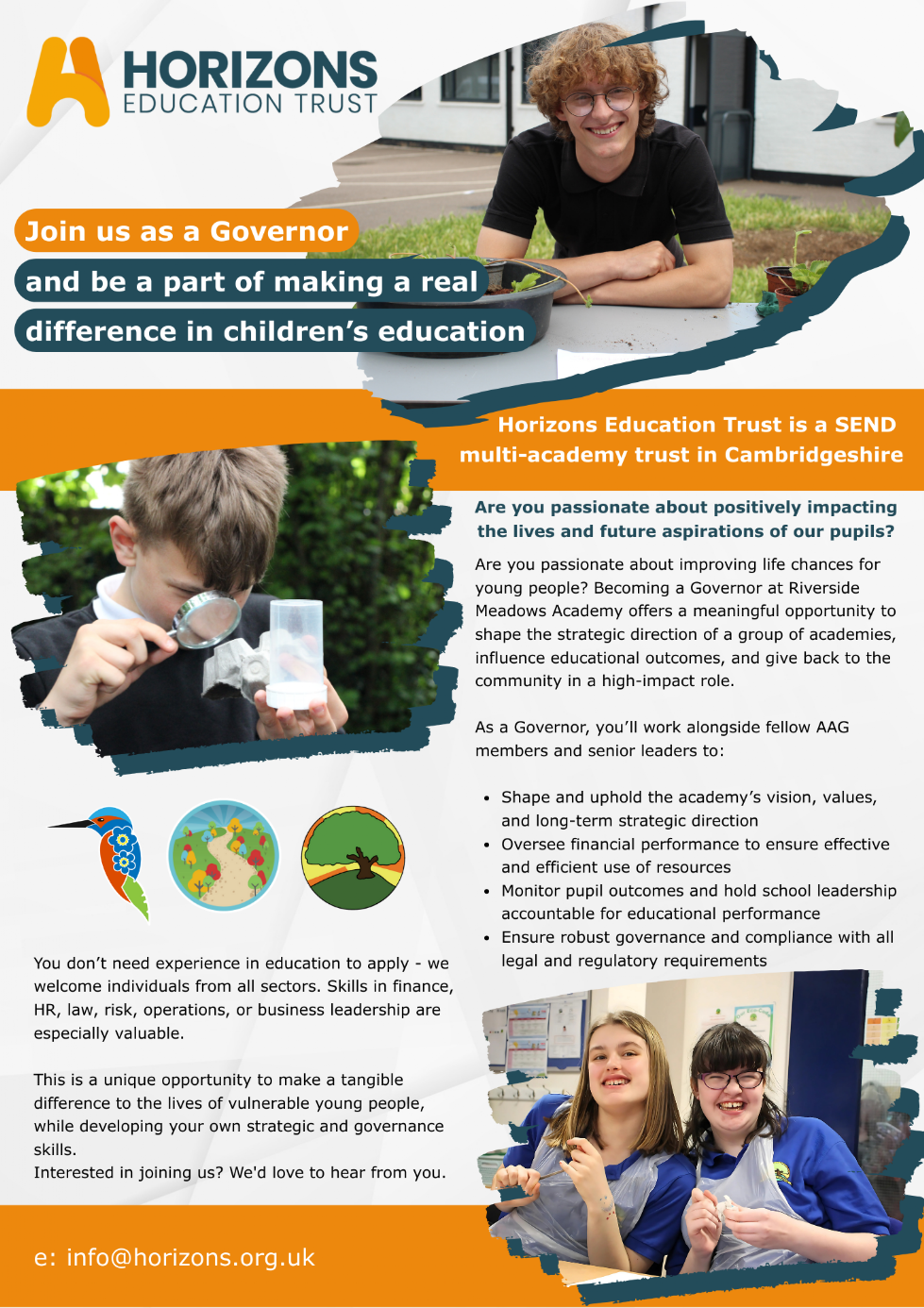 Riverside Meadows Academy is governed by an Academy Advisory Group (AAG). This group of people is made up of a chairperson, co-headteachers, a range of local business and community representatives and parent representatives. The AAG meets every half-term and minutes of the meetings are readily available.